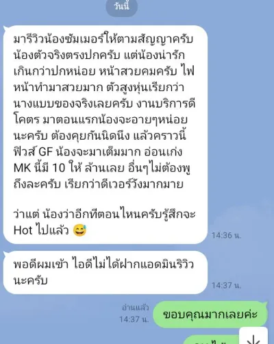 มารีวิวน้องซัมเมอร์ให้ตามสัญญาครับ น้องตัวจริงตรงปกครับ แต่น้องน่ารัก เกินกว่าปกหน่อย หน้าสวยคมครับ ไฟ หน้าทำมาสวยมาก ตัวสูงหุ่นเรียกว่า นางแบบของจริงเลยครับ งานบริการดี โคตร มาตอนแรกน้องจะอายๆหน่อย นะครับ ต้องคุยกันนิดนึง แล้วคราวนี้ ฟิวส์ GF น้องจะมาเต็มมาก อ่อนเก่ง MK นี้มี 10 ให้ ล้านเลย อื่นๆไม่ต้องพู ถึงละครับ เรียกว่าดีเวอร์วังมากมาย ว่าแต่ น้องว่าอีกทีตอนไหนครับรู้สึกจะ Hot ไปแล้ว