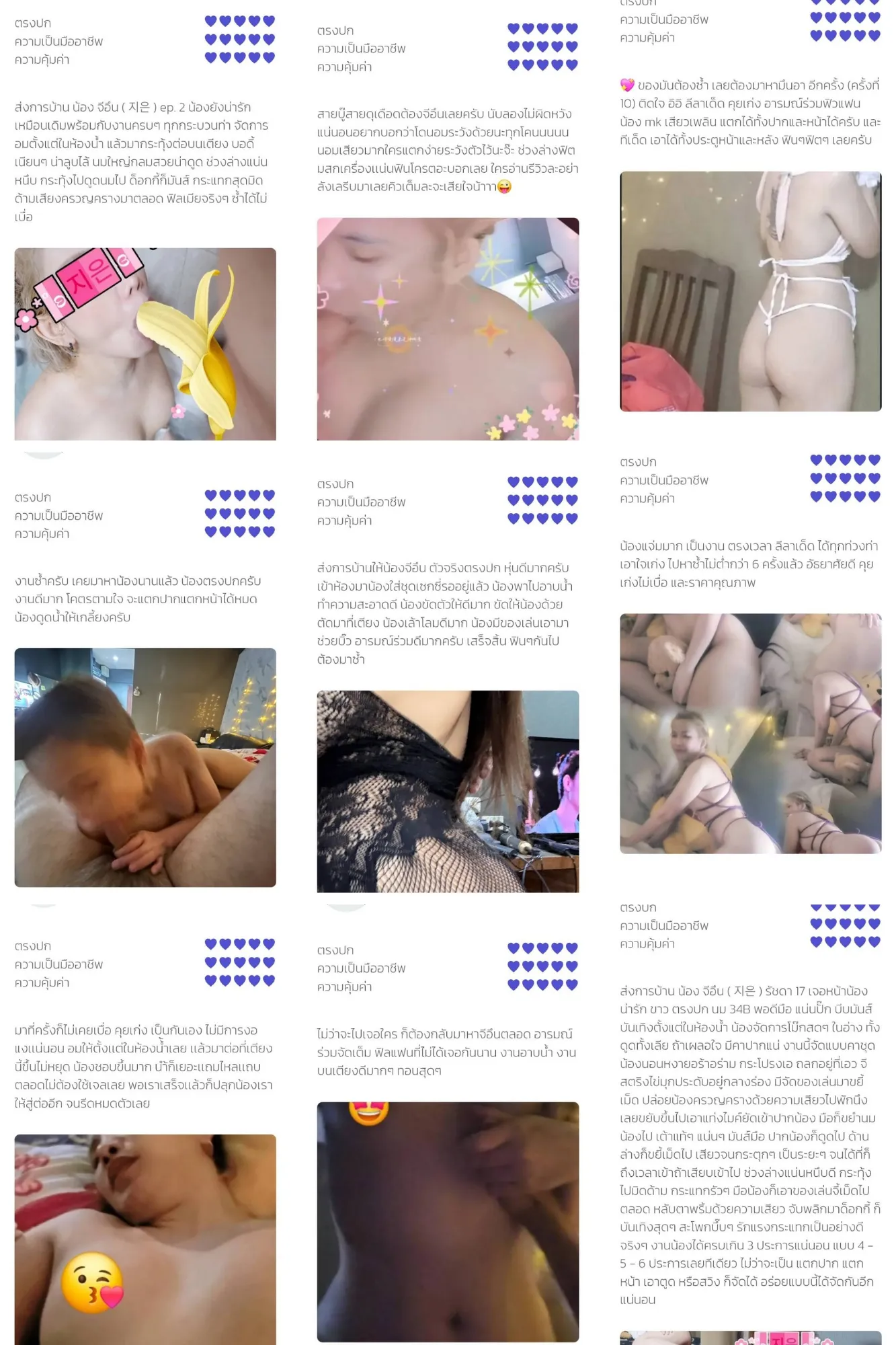 อ้างอิงจากโปรไฟล์เดิมเข้ารหัสไม่ได้ ชื่อ (จีอึนK-pop) แต่เข้าไปดูได้ (บางครั้ง) ลิงค์: https://fan4you.nl/content/67e124ab293a9a09ac0aa3f4 น้องแจ่มมาก เป็นงาน ตรงเวลา ลีลาเด็ด ได้ทุกท่วงท่า เอาใจเก่ง ไปหาช้ำไม่ต่ำกว่า 6 ครั้งแล้ว อัธยาศัยดี คุย เก่งไม่เบื่อ และราคาคุณภาพ