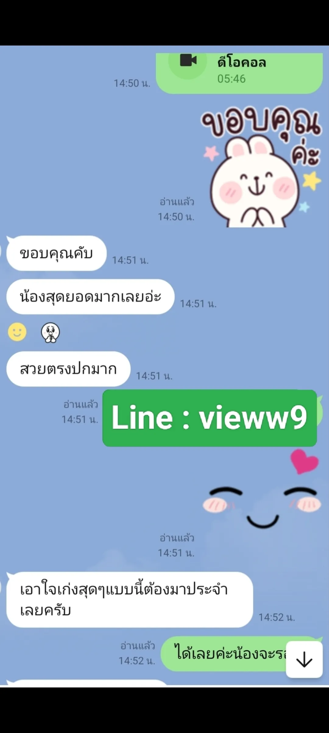 ขอบคุณพี่ๆใจดีที่มาใช้บริการคอลเสียวกับน้องวิวนะคะ รีวิวนี้ได้รับอนุญาตจากลูกค้าแล้วนะคะ **ขอปิดชื่อ ลค.ไว้นะคะ**