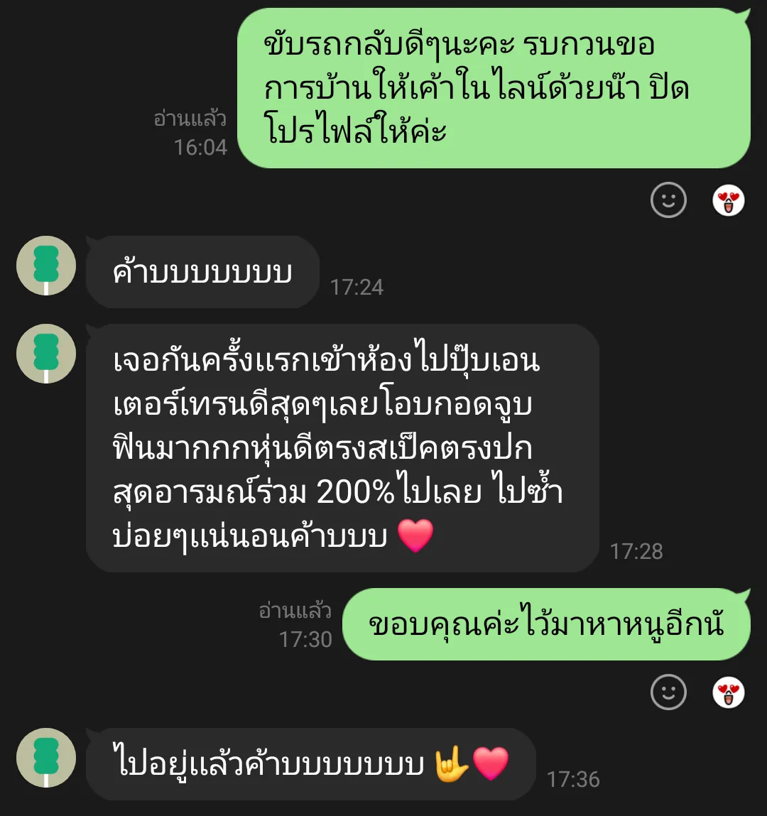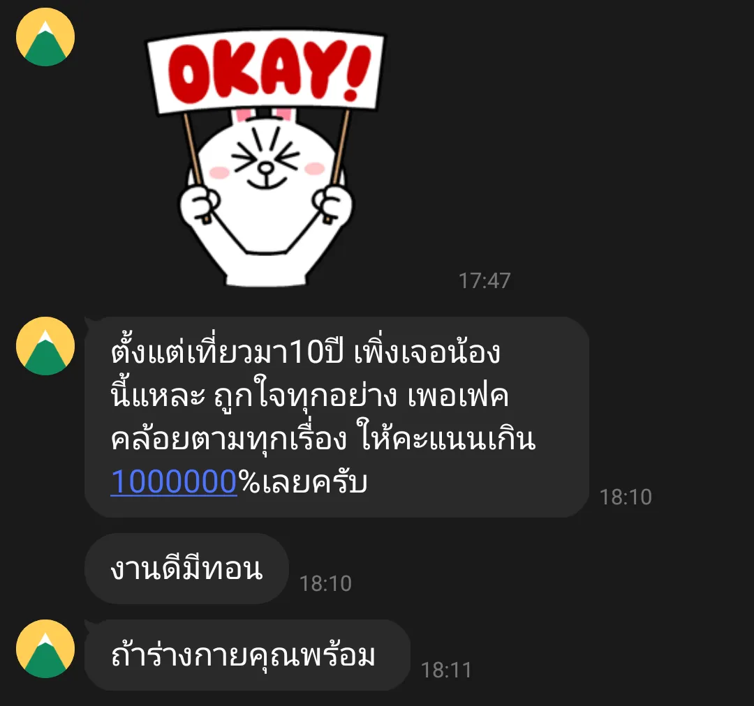 น้องน่ารักมาก ๆ เลยครับ คุยเก่ง อ้อนเก่งมากก เป็นทั้งไทป์หมาน้อยและแมวน้อยสลับกัน ตกเหวอย่างจังเลยครับ ส่วนเนื้องานน้องเต็มที่มาก รักกกกก และก็มีบางอย่างที่น้องทำไม่ได้ซึ่งน้องบอกก่อนและผมก็โอเคเพราะส่วนอื่นน้องดีมากกกครับ ยังไงก็สุภาพให้เกียรติและใจดีกับน้องมาก ๆ นะครับ ❤️