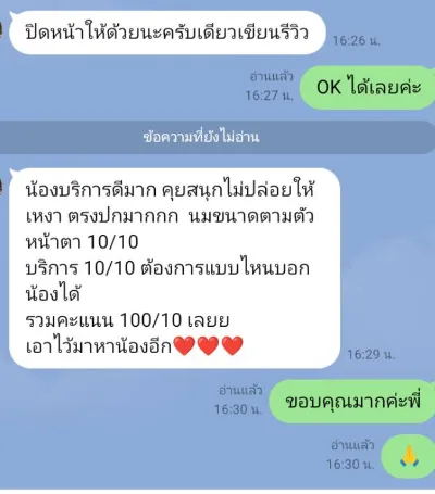 น้องบริการดีมาก คุยสนุกไม่ปล่อยให้เหงา ตรงปกมากกก นมขนาดตามตัว หน้าตา 10/10 บริการ 10/10 ต้องการแบบไหนบอกน้องได้ รวมคะแนน 100/10 เลยย เอาไว้มาหาน้องอีก❤️❤️❤️